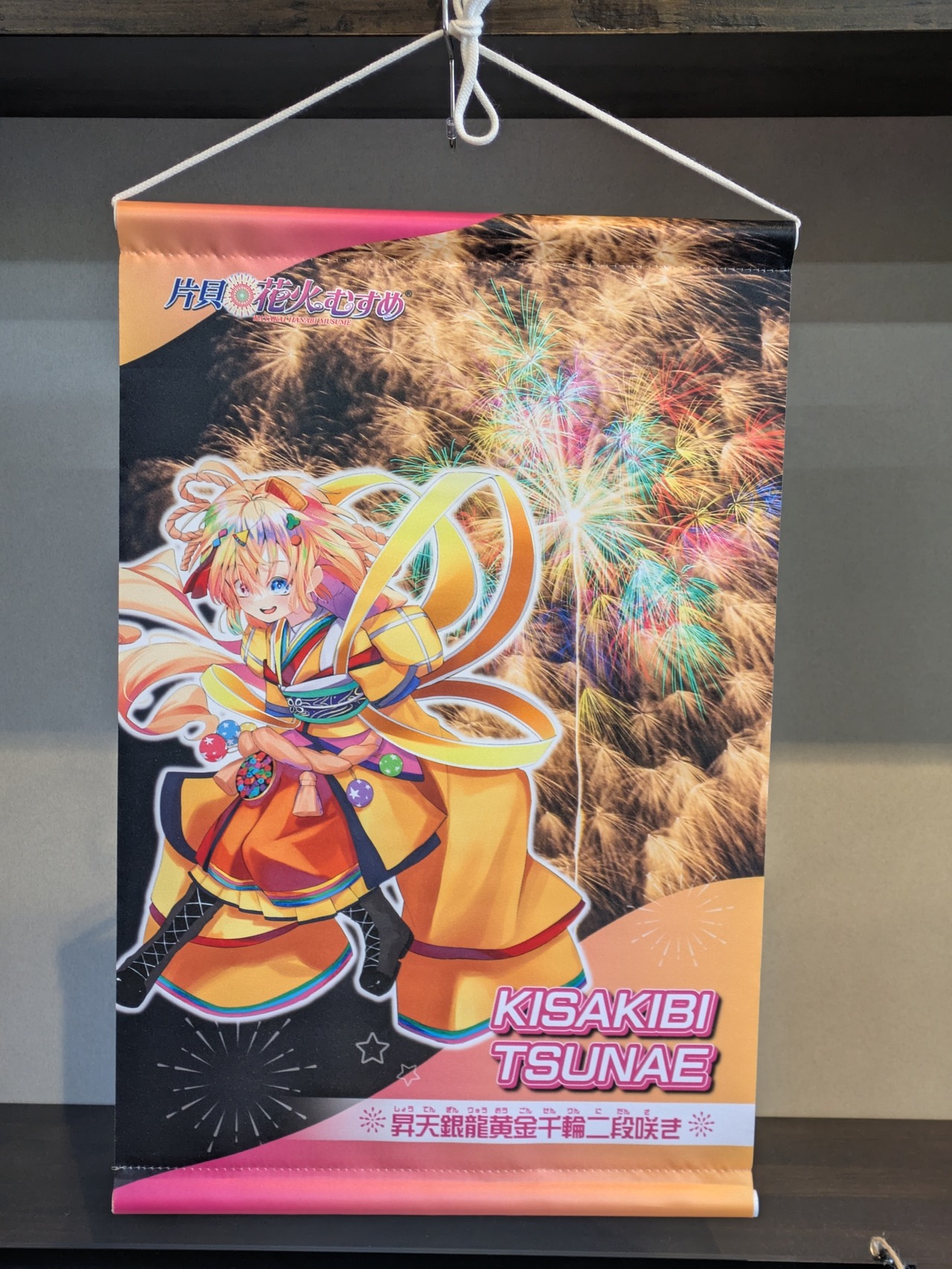 片貝煙火工業の花火を擬人化したキャラクター「片貝花火むすめ」のタペストリー(直径約30cm・高さ約45cm・全6種類)です。