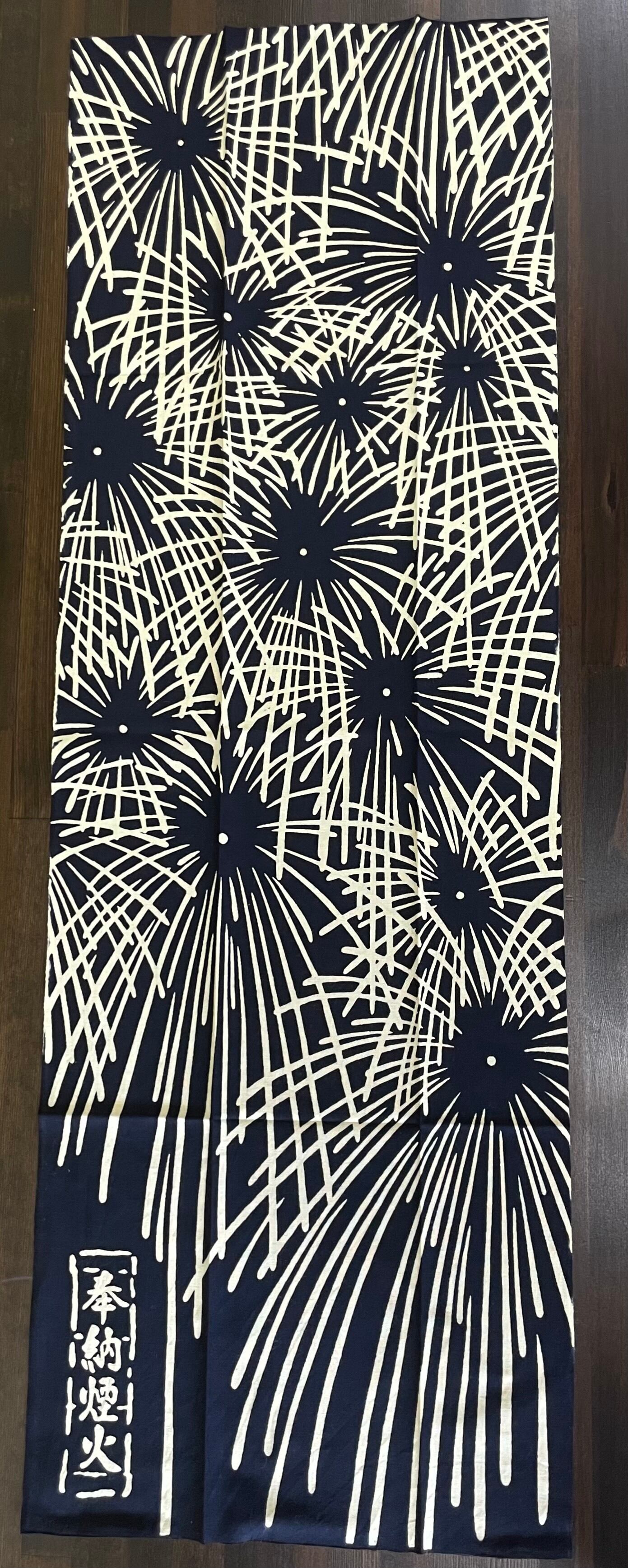スターマイン(連発花火)をモチーフにしたデザインで、日本特有の「二度染」「注染」という2種の手法が使われております。